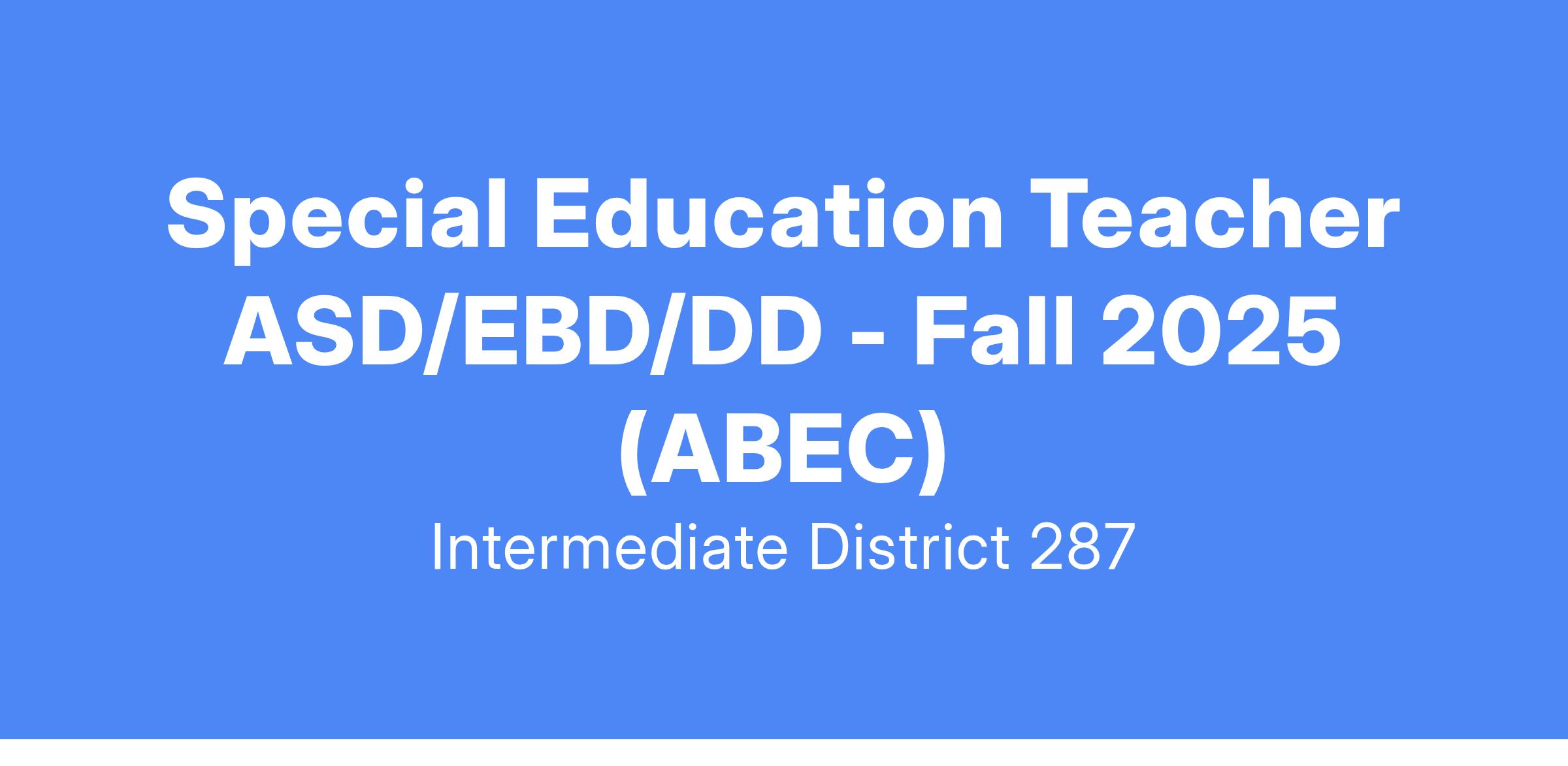 Intermediate District 287 is looking for Special Education Teachers licensed in ASD, EBD, or DD at our Ann Bremer Education Center in Brooklyn Park, MN!