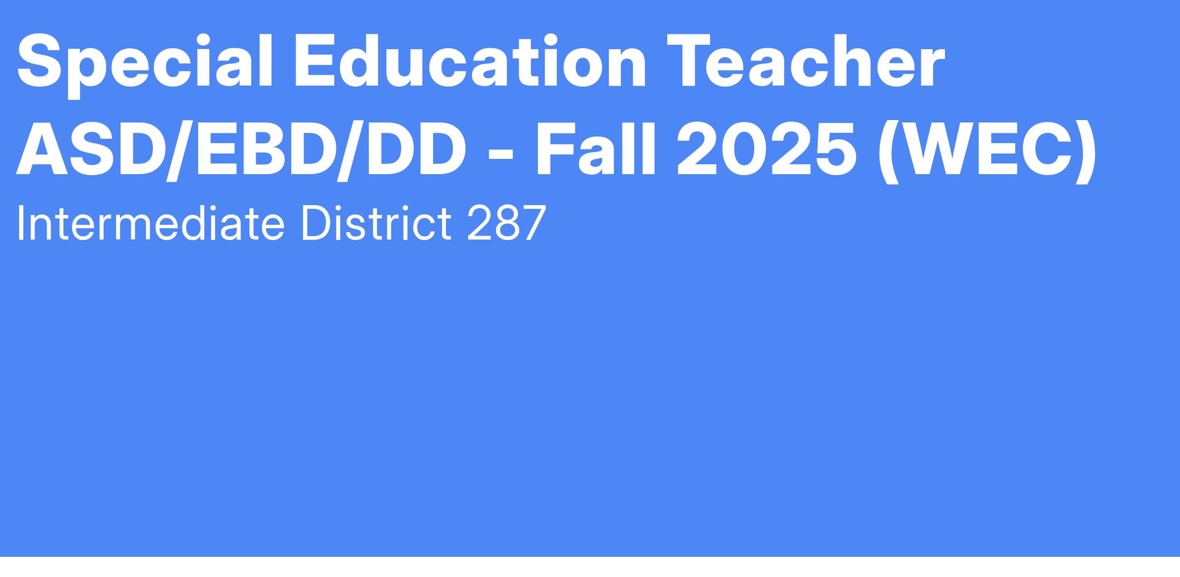 Intermediate District 287 is looking for Special Education Teachers licensed in ASD, EBD, or DD at our West Education Center in Minnetonka, MN!