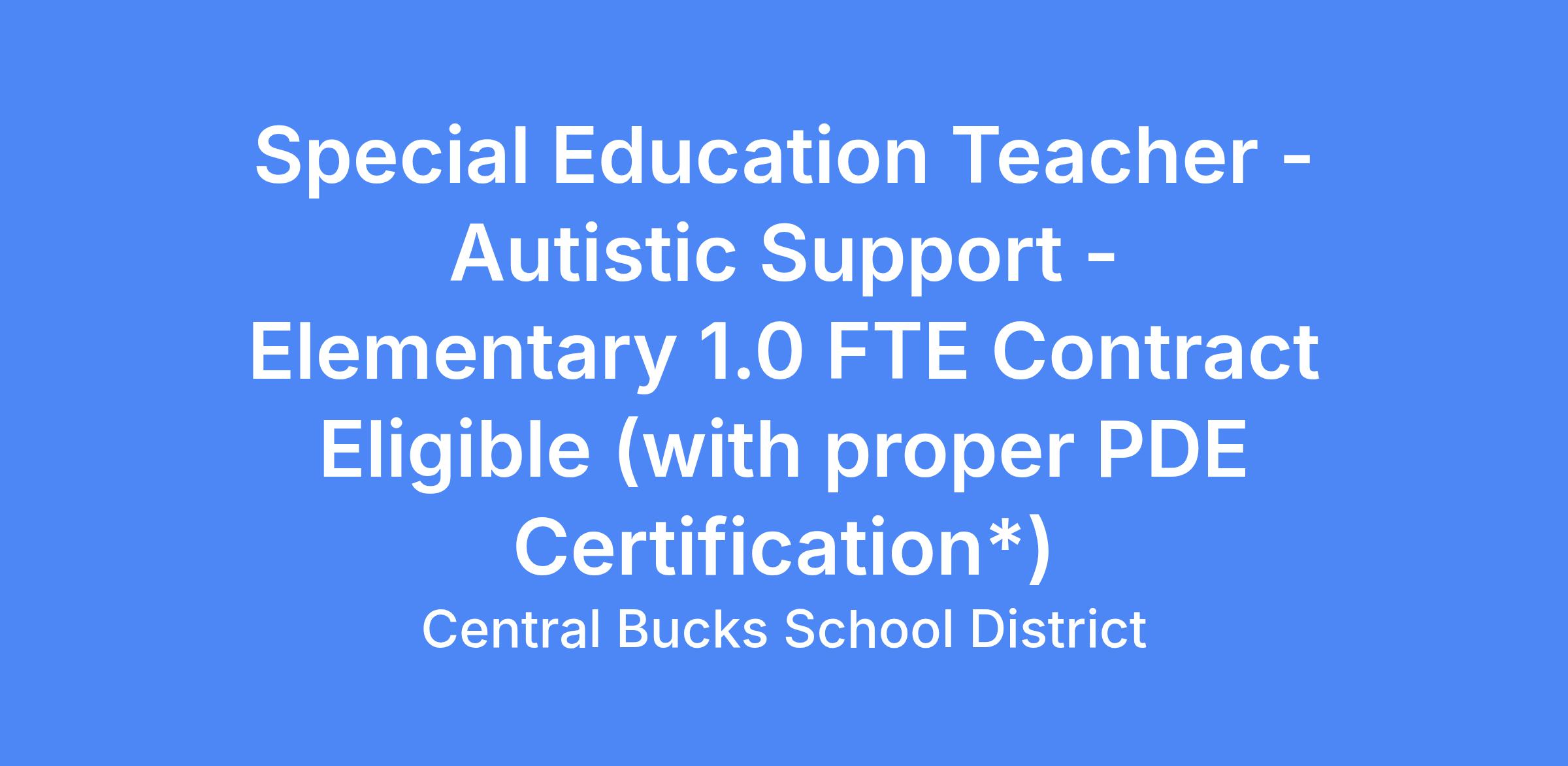 | POSITION: | Special Education Teacher - Autistic Support - Elementary Contract Eligible (with proper PDE Certification*) |