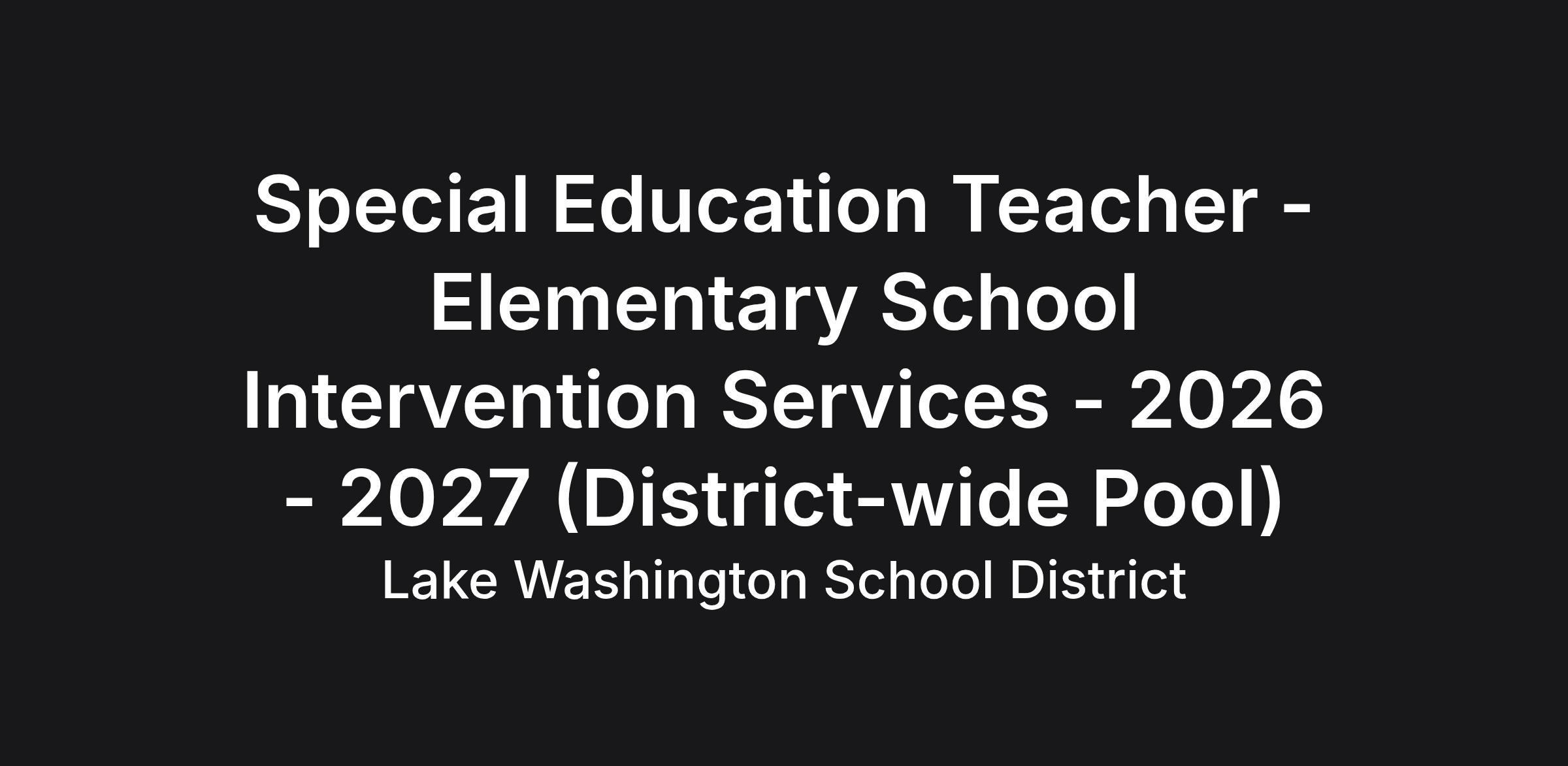 Lake Washington School District is looking for qualified elementary school Special Education Teacher candidates for positions in an Intervention Services setting for the 2026 - 2027 school year. This general posting will be used to generate an applicant pool for these positions. As specific openings are identified, building administrators will contact you if you are selected for an interview.