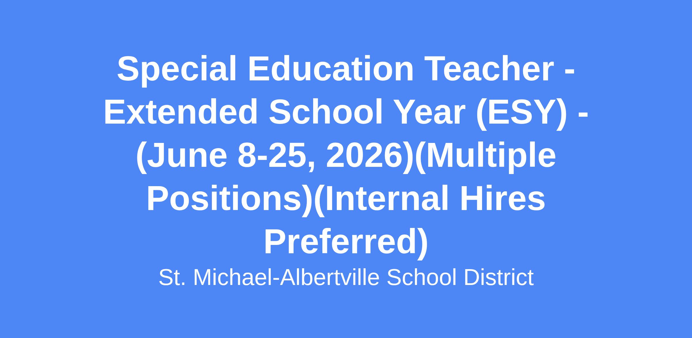 Bachelor’s degree in education and required teaching certificate in Special Education as required by the State of Minnesota, specific content knowledge, training, or job experience required before appointment, and successful student teaching. Dual licensure preferred but not required.