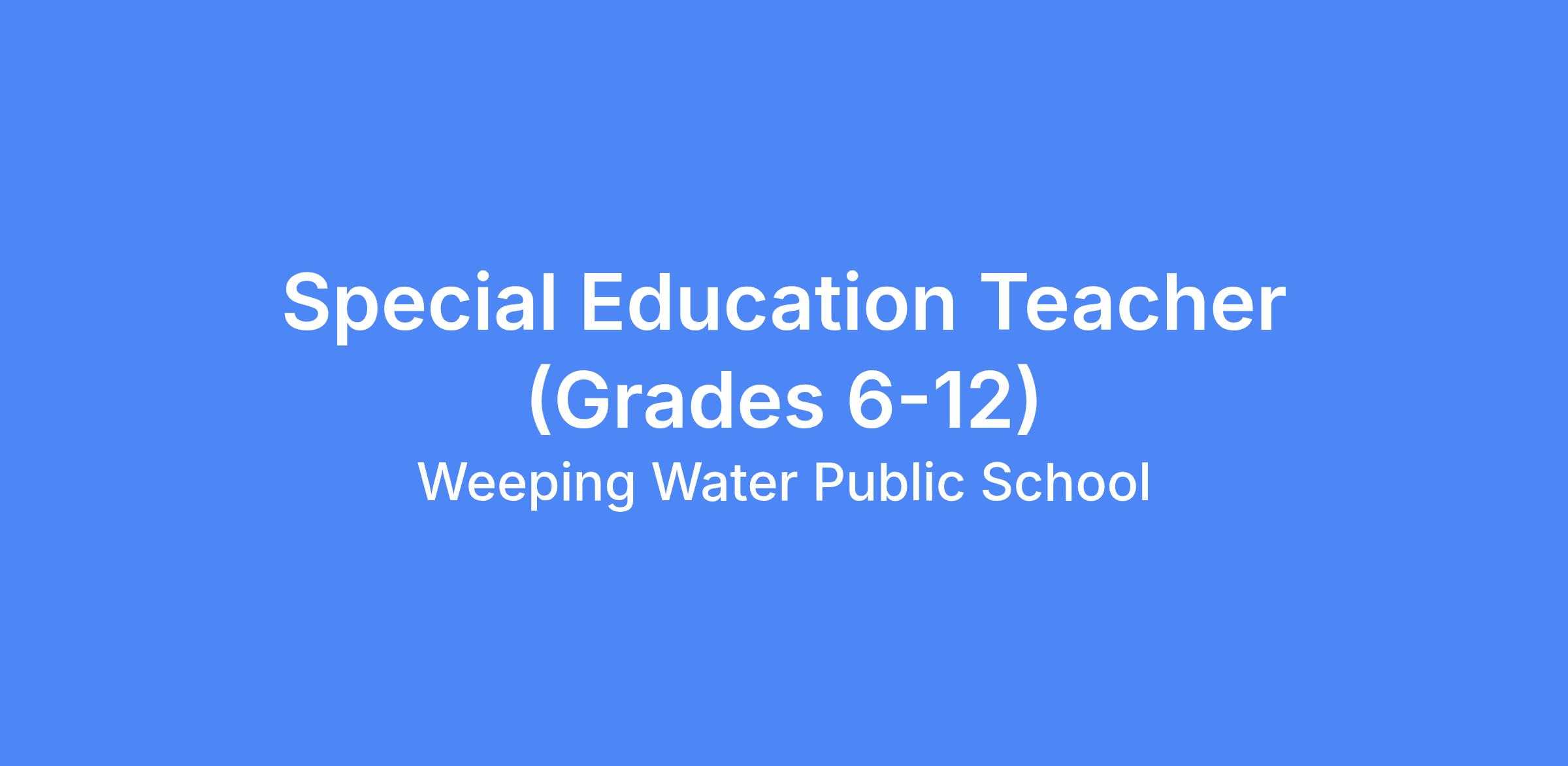 Weeping Water Public Schools is seeking a dedicated and student-centered 6–12 Special Education Teacher to join our team. We are a close-knit rural district committed to academic excellence, strong community partnerships, and meeting the diverse needs of every learner.