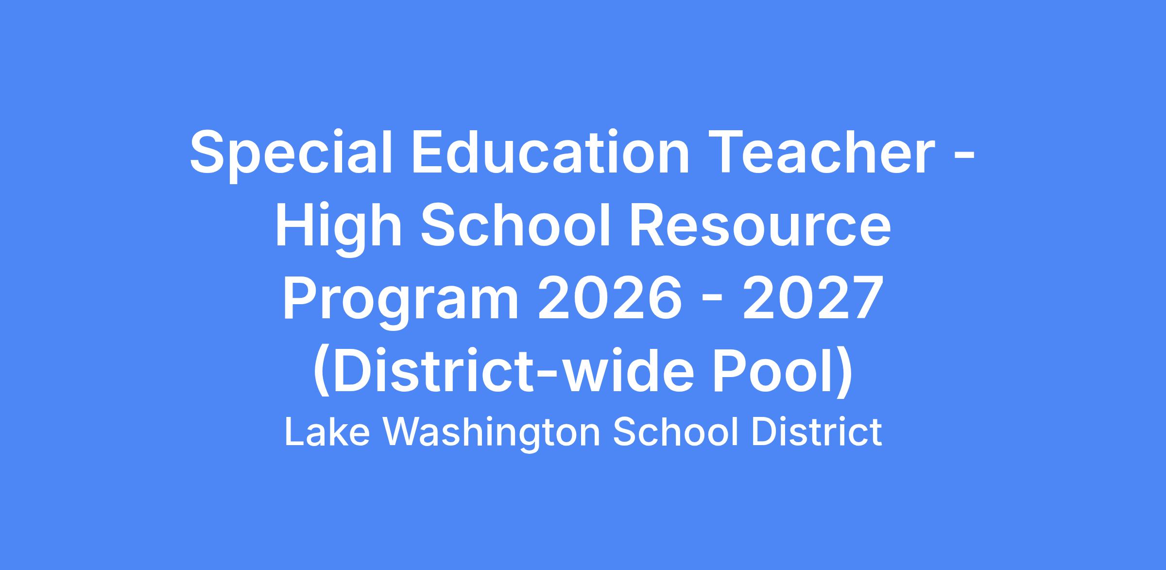 Lake Washington School District is looking for qualified high school Special Education Teacher candidates for positions in a resource program setting in the 2026 - 2027 school year. This general posting will be used to generate an applicant pool for these positions. As specific openings are identified, building administrators will contact you if you are selected for an interview.