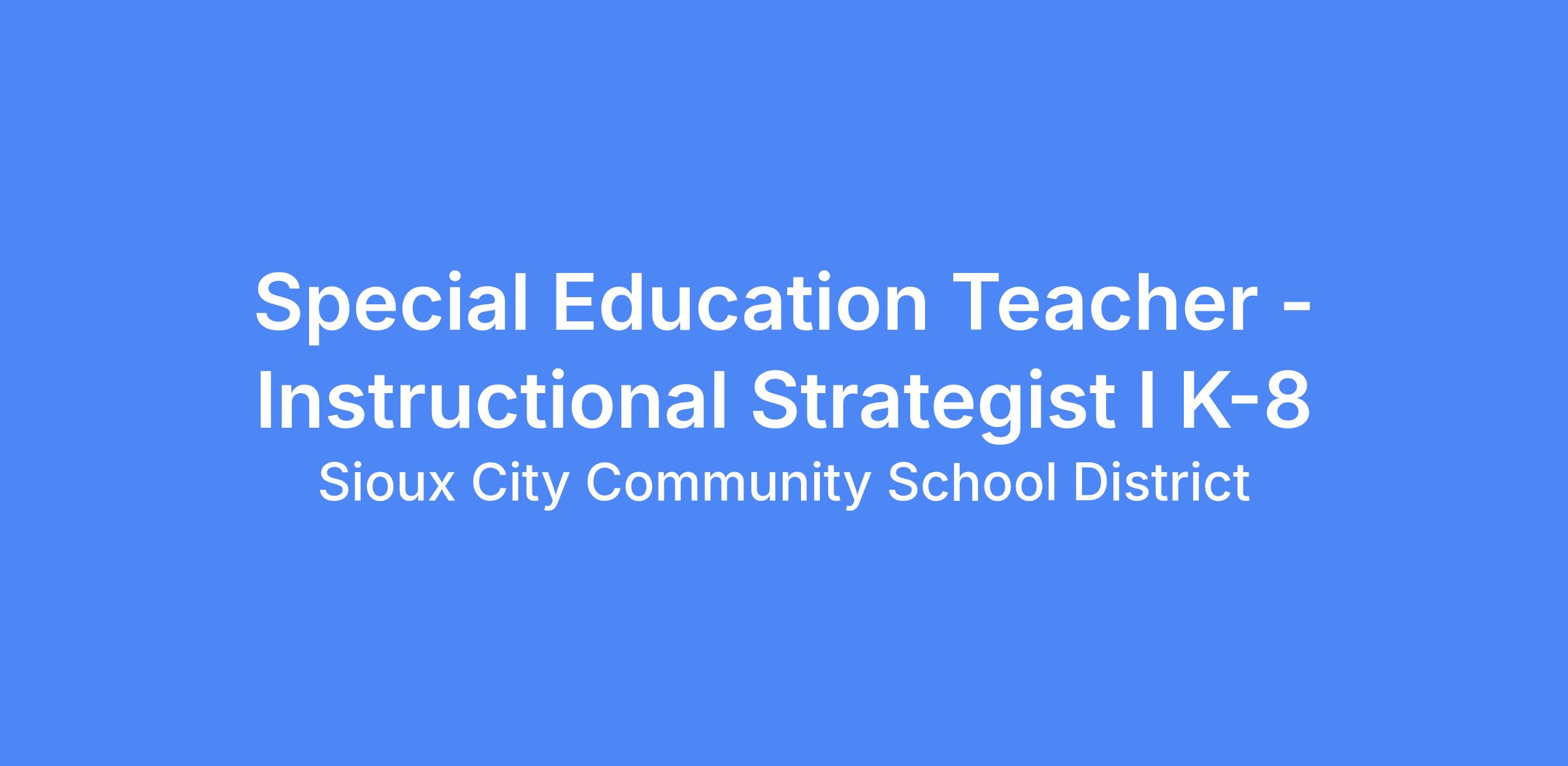 The special education teacher is the educational leader in the classroom and will ensure that the Sioux City Community School District programs and curricula are implemented in a way that maximizes student-learning experiences. The teacher is responsible for the supervision and evaluation of all students within his/her teaching assignment. Consistent with the Department of Education and Sioux City Community School District policies, the teacher will work within an established framework for the delivery of educational services which support student learning for students with mild/moderate disabilities affecting behavior, academics, or communication. This may include students who have specific learning disabilities, those who learn like students with autism, and those who have mild behavior challenges. Working collaboratively with a team of educational professionals, the teacher will demonstrate a strong commitment to planning for the improvement of student achievement. Teaches students academic, social, executive functioning and communication skills, organizes and presents instruction in an environment which helps students learn the subject matter and teaches skills that will contribute to their educational and social development.