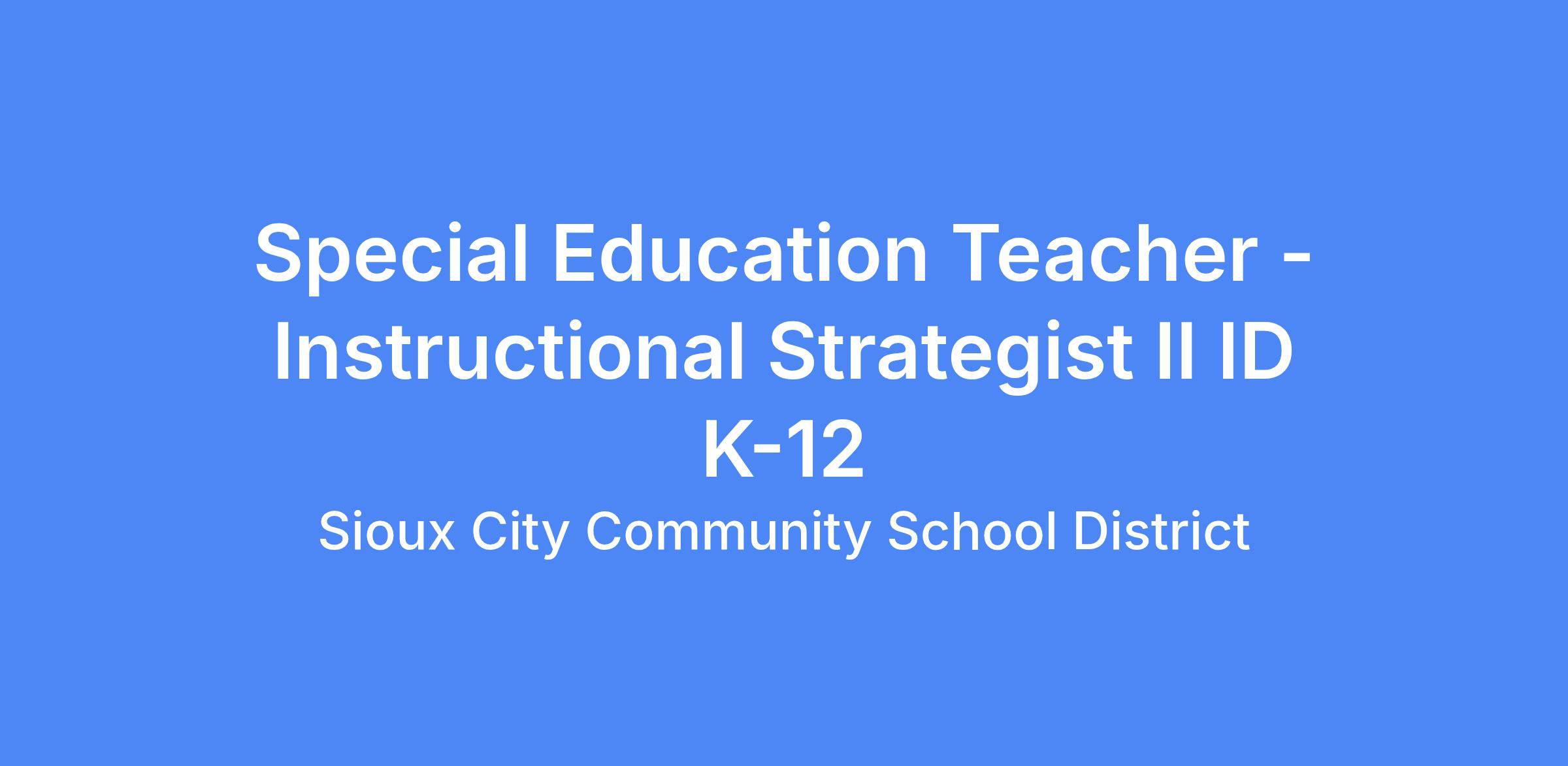 Minimum qualifications include a valid Iowa teaching certificate, a Bachelor’s Degree from an accredited college or university with a major or endorsement in Special Education. Must possess proper state certification and licensure for the position. A candidate who has, or is able to obtain, a Conditional License for the Instructional Strategist II ID endorsement will also be considered. The employee is expected to demonstrate continued professional growth specific to the program(s).