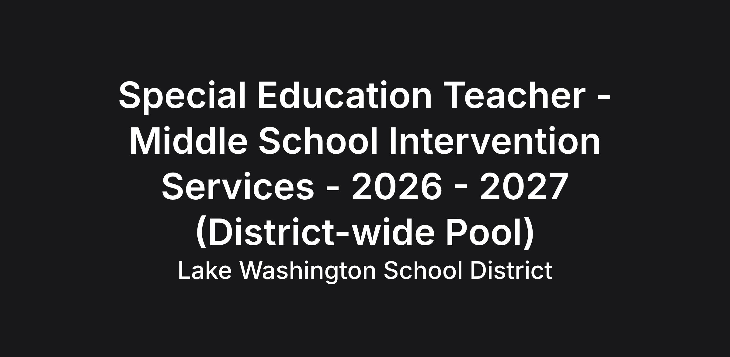 Lake Washington School District is looking for qualified midd school Special Education Teacher candidates for positions in an Intervention Services setting for the 2026 - 2027 school year. This general posting will be used to generate an applicant pool for these positions. As specific openings are identified, building administrators will contact you if you are selected for an interview.
