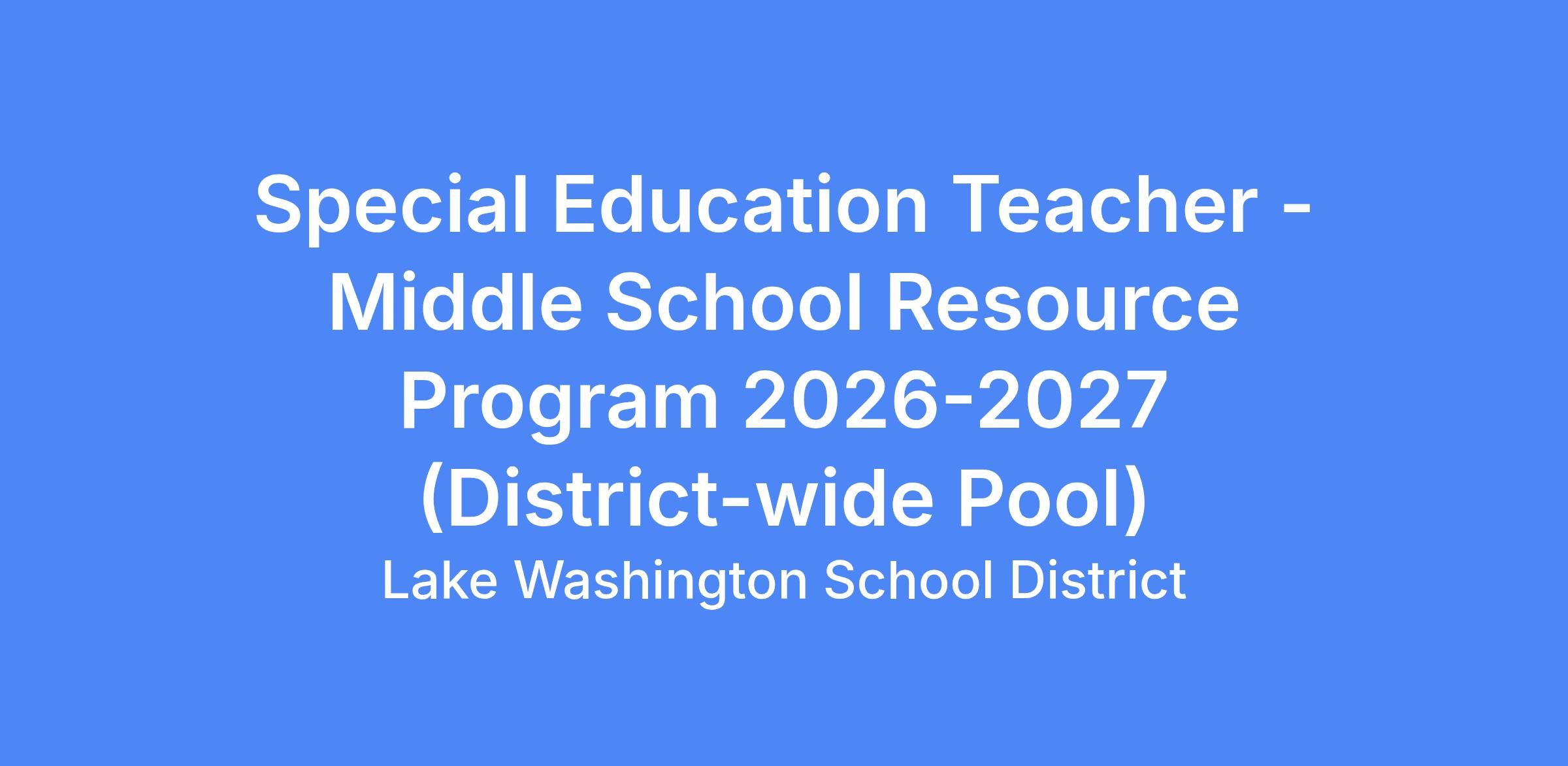 Lake Washington School District is looking for qualified middle school Special Education Teacher candidates for positions in a Resource Program setting for the 2026 - 2027 school year. This general posting will be used to generate an applicant pool for these positions. As specific openings are identified, building administrators will contact you if you are selected for an interview.