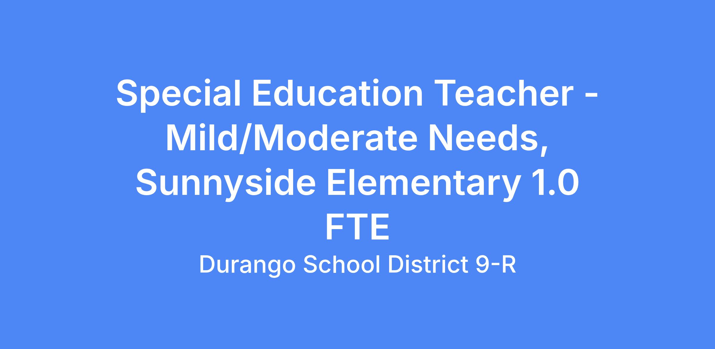 Durango School District is accepting applications for a Mild/Moderate Needs Special Education Teacher to join the team at Sunnyside Elementary for the 2025/2026 school year. Must meet CDE and ESSA's requirements for In-Field Teacher in Special Education by the start date. Begins January 26, 2026 or ASAP.