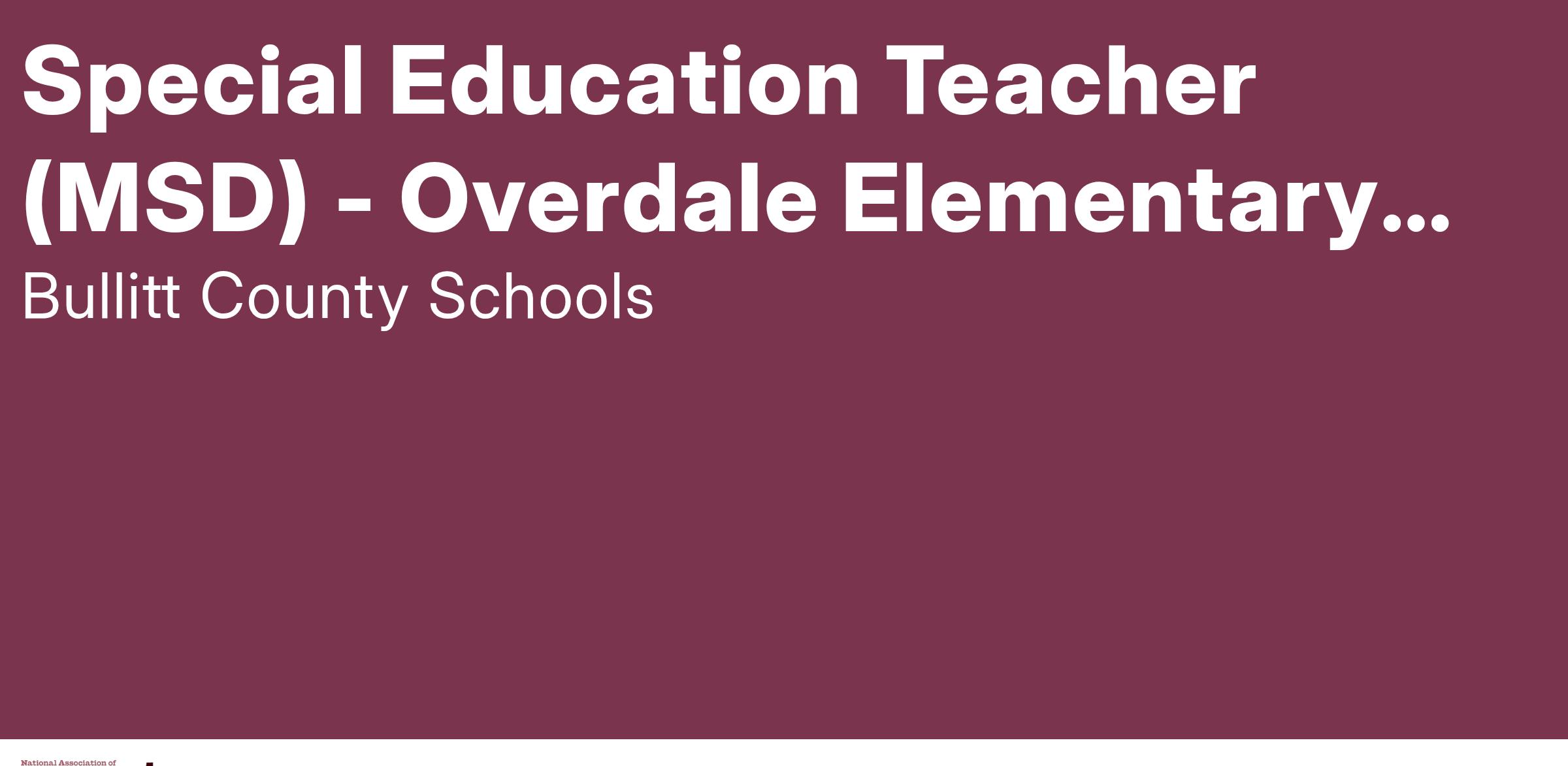 Overdale ES has a vacancy for a MSD Special Education Teacher. Candidates should hold certification for teaching students with Mental to Severe Disabilities. This individual will be responsible for planning, organizing and delivering a program of instruction that supports the premise that high expectations for all students are possible, also implements activities that assists students reaching mastery, and is committed to acheiving our school mission where we "strive to grow all students into productive members of society by providing engaging, rigorous instruction with high expectations in an environment of mutual respect and appreciation".