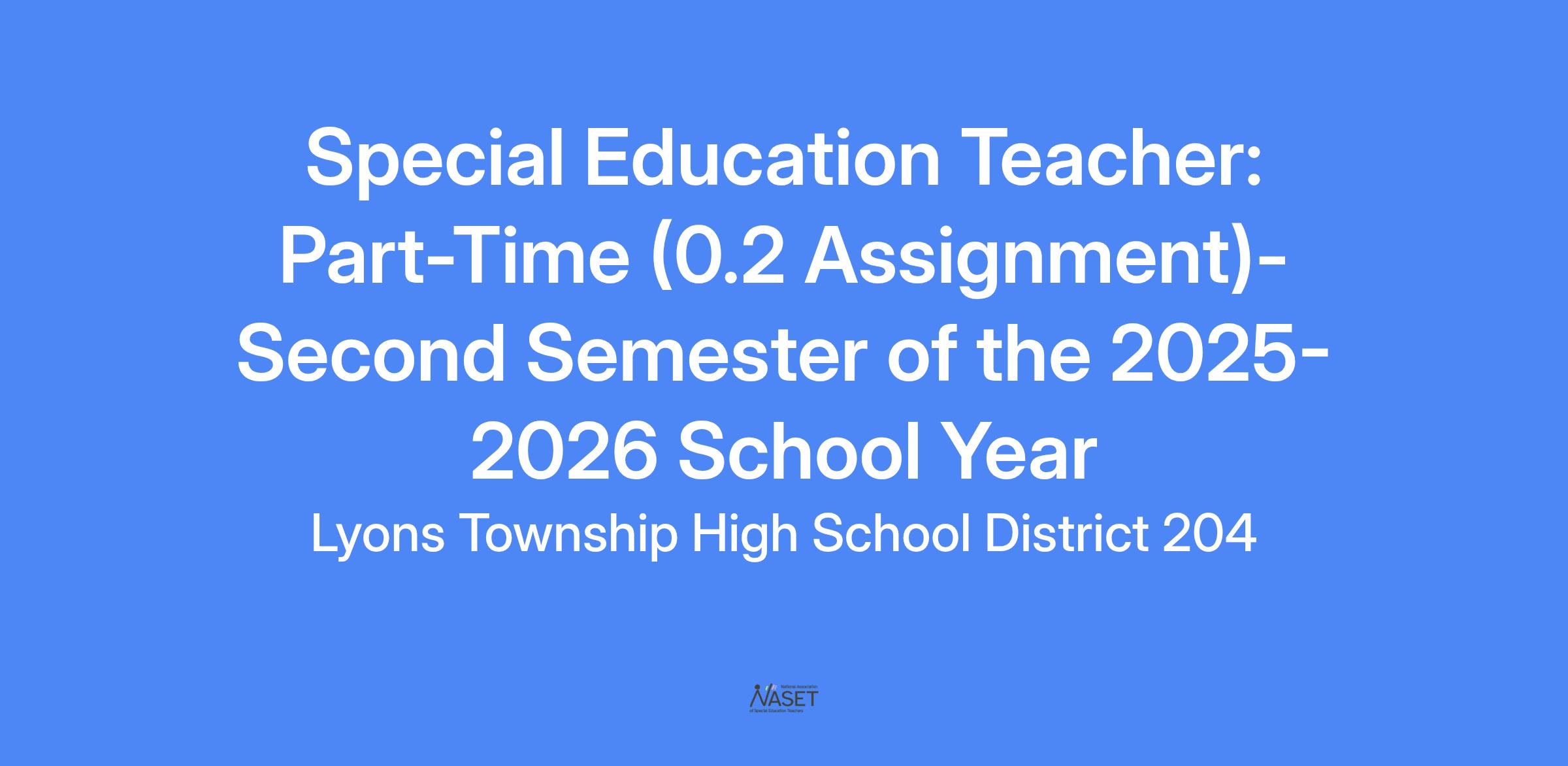 Lyons Township High School is currently accepting applications for a part-time Special Education Teacher assignment for the second semester of the 2025-2026 school year. This position will be responsible for teaching two periods and will have one planning/preparation period per day. Compensation for this role will be based on a 20% proration of the full-time annual salary, as determined by placement on the certified teacher salary schedule per the LTEA Negotiated Agreement.