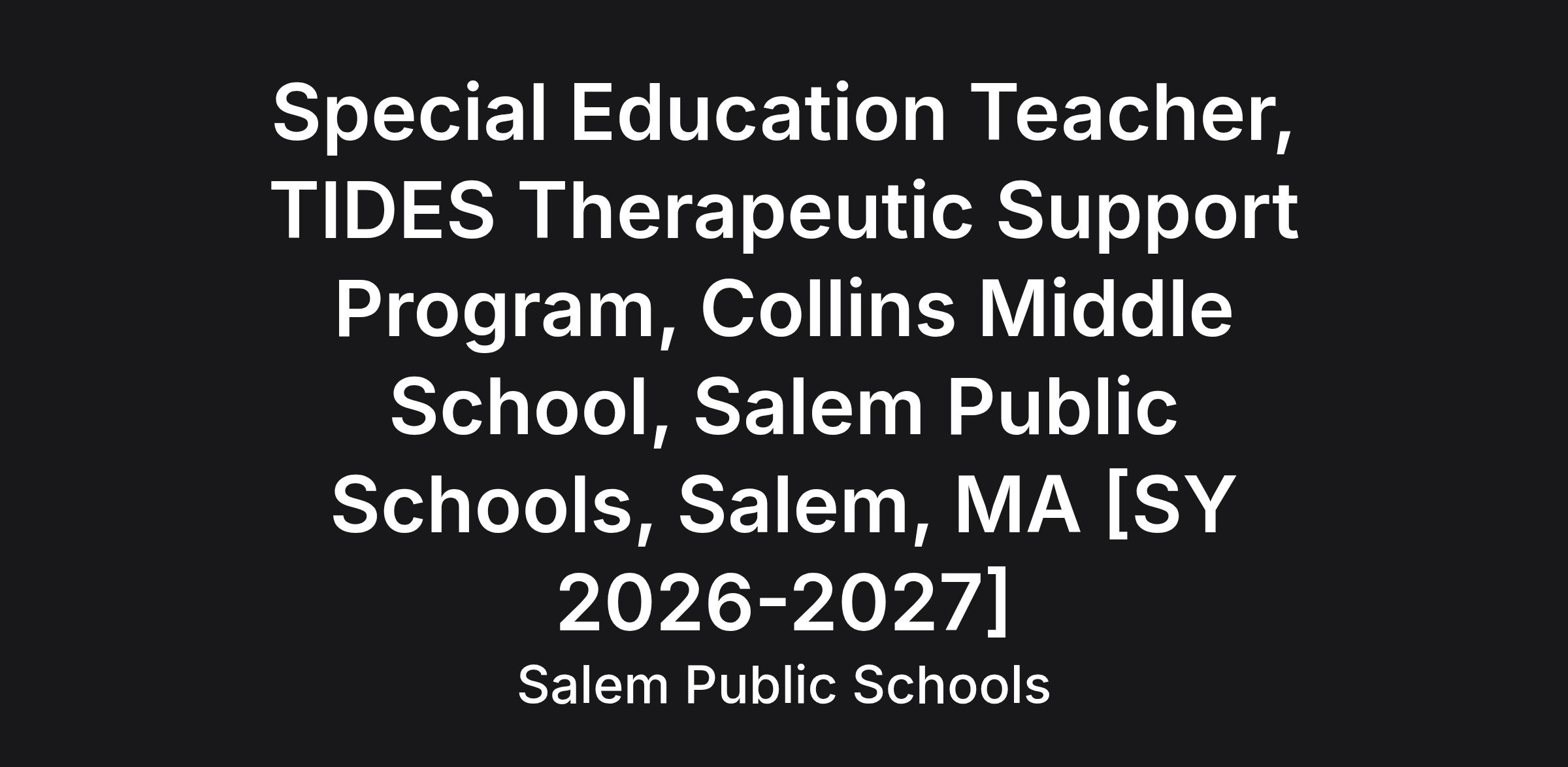 Special Education Teacher, TIDES Therapeutic Support Program, Collins Middle School, Salem Public Schools, Salem, MA [SY 2026-2027]