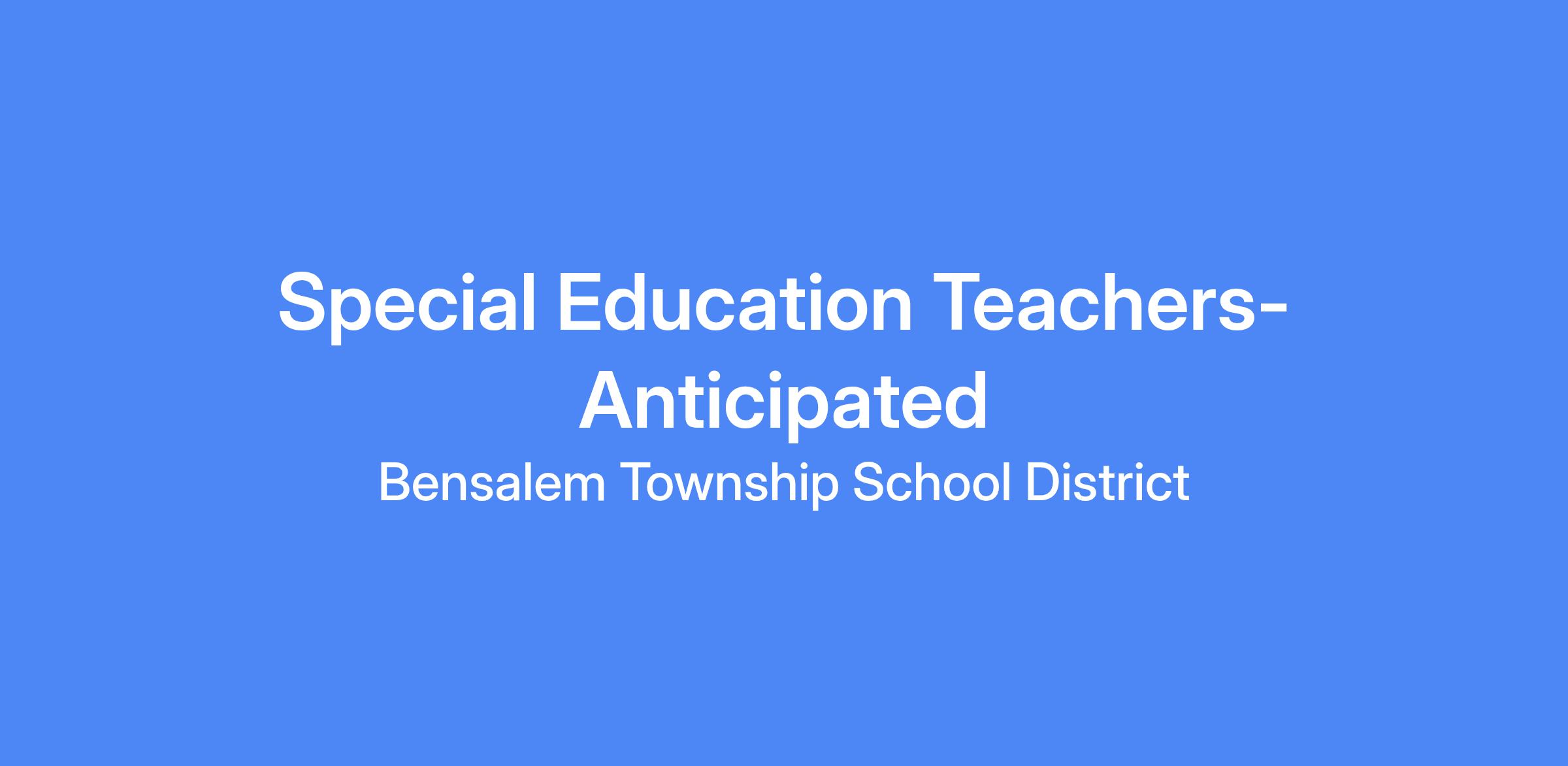 The Bensalem Township School District is anticipating hiring Special Education Teacher for 2026-2027 School Year. There are several anticipated openings District Wide.