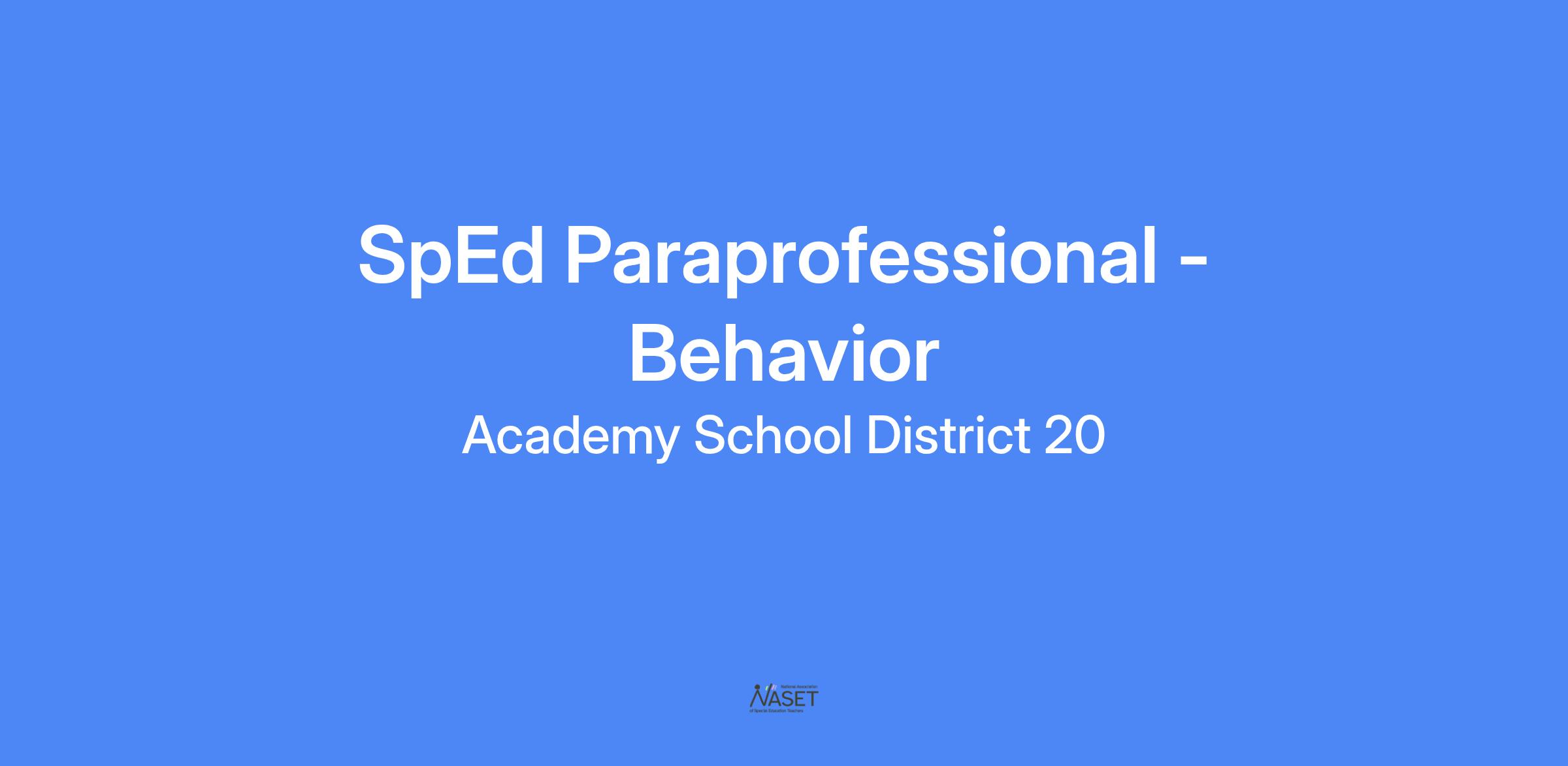 11/03/2025SpEd Paraprofessional - Behavior independently implements behavior programs as instructed by behavior coordinator and/or IEP team and models behavioral programming for staff members who work with students with behavior problems.The following statements are illustrative of the essential functions of the job and other key duties that may be required. The description may not include all functions performed by the incumbents in various locations. The district reserves the right to modify or change the duties or the essential functions of this job at any time.