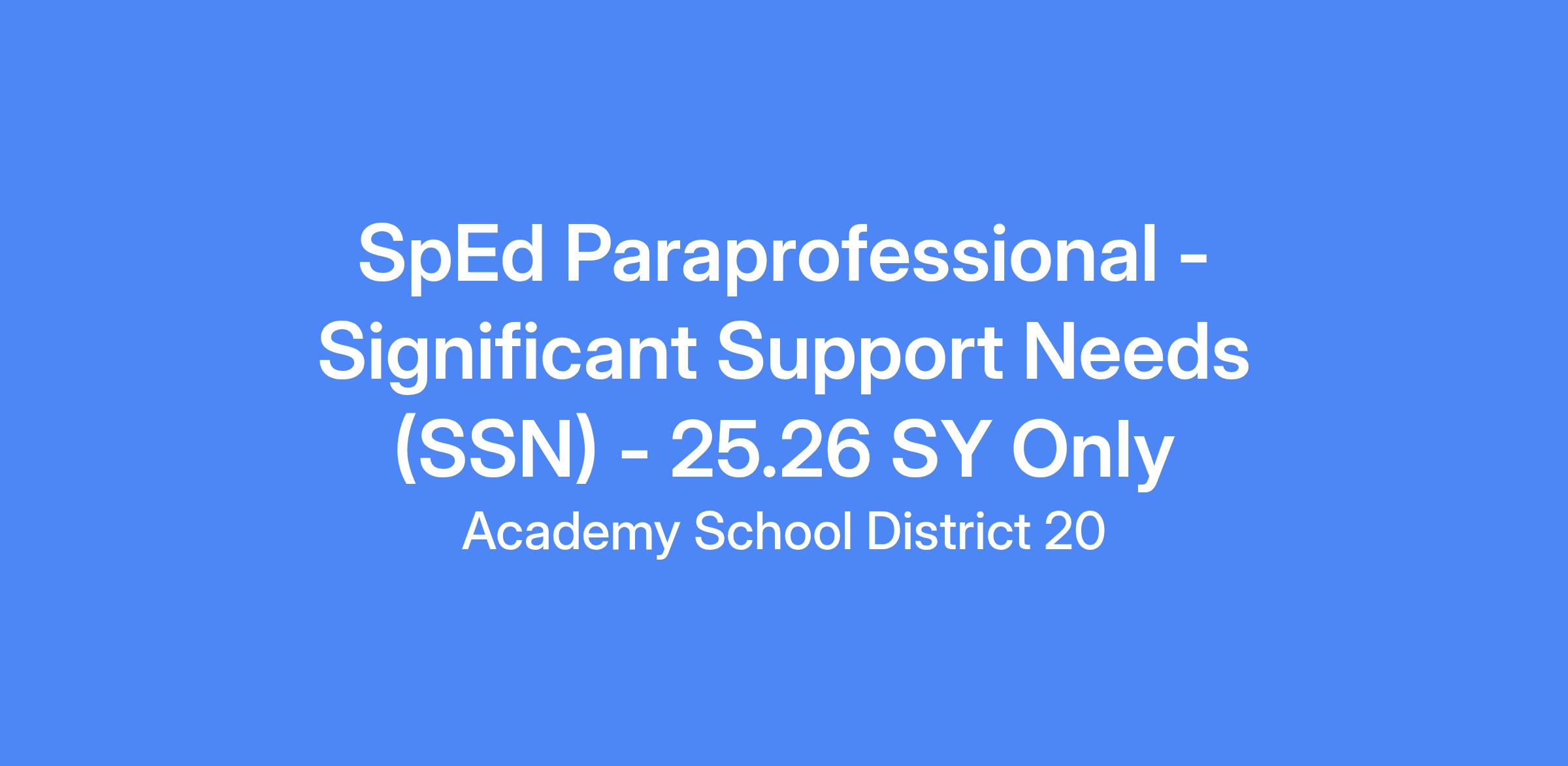 01/05/2026SpEd Paraprofessional - SSN performs the day-to-day activities of teaching special education students while under the supervision of a teacher. The paraprofessional does not make diagnostic or long-term education decisions regarding special education students. This includes individuals who may or may not be licensed. Assignments may involve non-traditional learning environments such as building and off-campus work sites. Supports the principal and classroom teachers in implementing the Significant Support Needs (SSN) programs and encourage a positive and safe learning environment. Assists the licensed special education teachers, occupational therapists, physical therapists, nurses, and other evaluative staff in the implementation of the goals of severely/profoundly disabled students.This position is for the 2025-2026 School Year only.