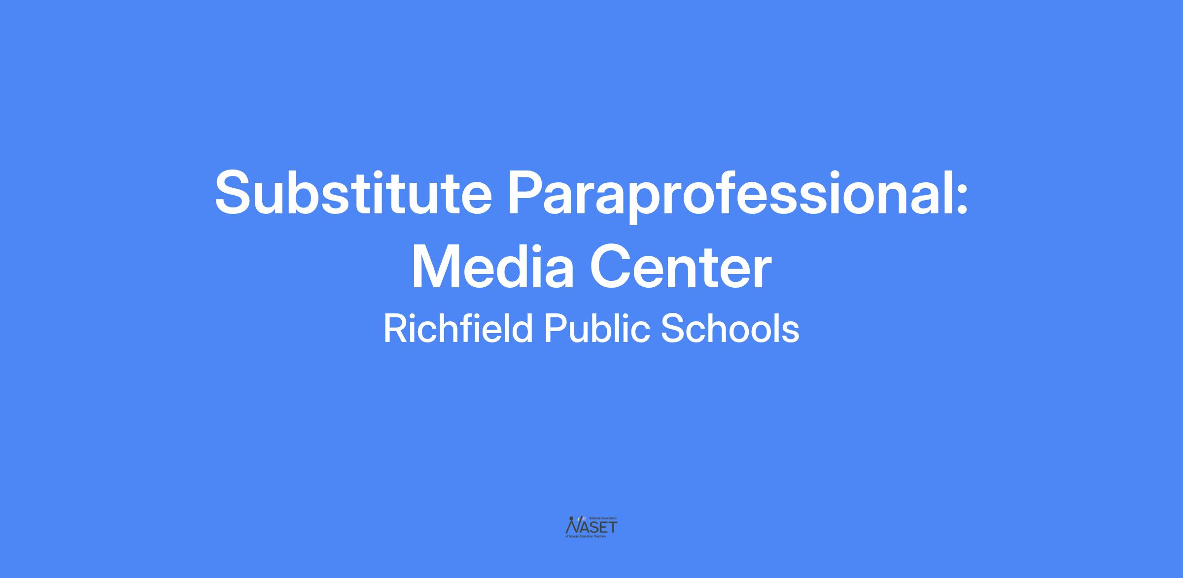 The Richfield Public School District is currently accepting applications for a Substitute Paraprofessional: Media Center at Richfield Middle School, starting November 2025 through December 2025. The Media/Technology Paraprofessional will create and maintain a positive learning environment in the media center and provide pre-planned Library and/or Technology lessons to classrooms as assigned. This position also maintains the media center (checking out/in, restocking, purchasing ebooks, barcoding all materials, etc.) and supports Chromebooks and technology.