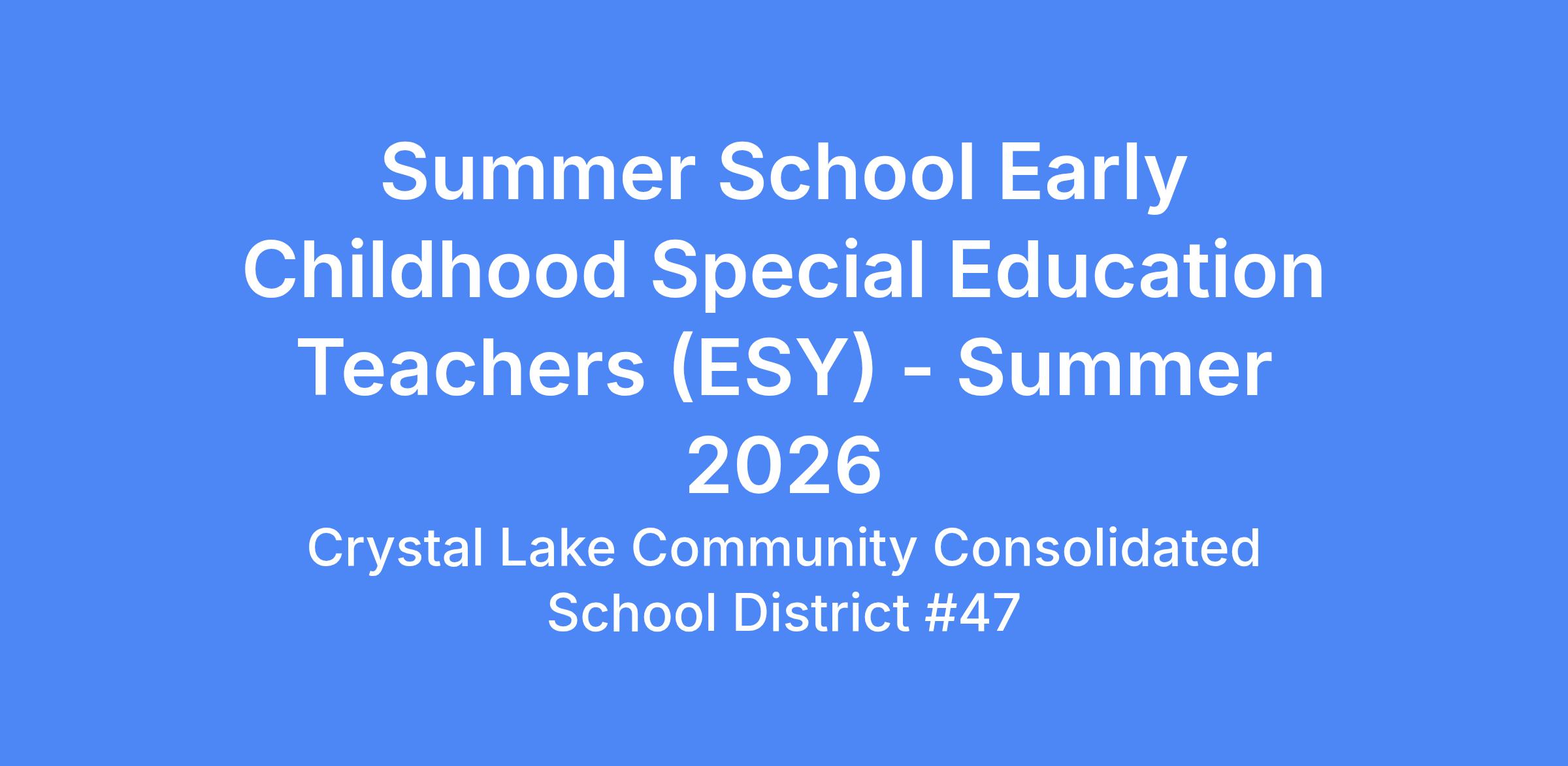 Crystal Lake School District 47 currently has openings for Summer School Early Childhood Special Education Teachers (ESY). The goal of this position is to provide a well-managed classroom environment where students with disabilities have an opportunity to succeed in accordance with their Individual Educational Plan (IEP).