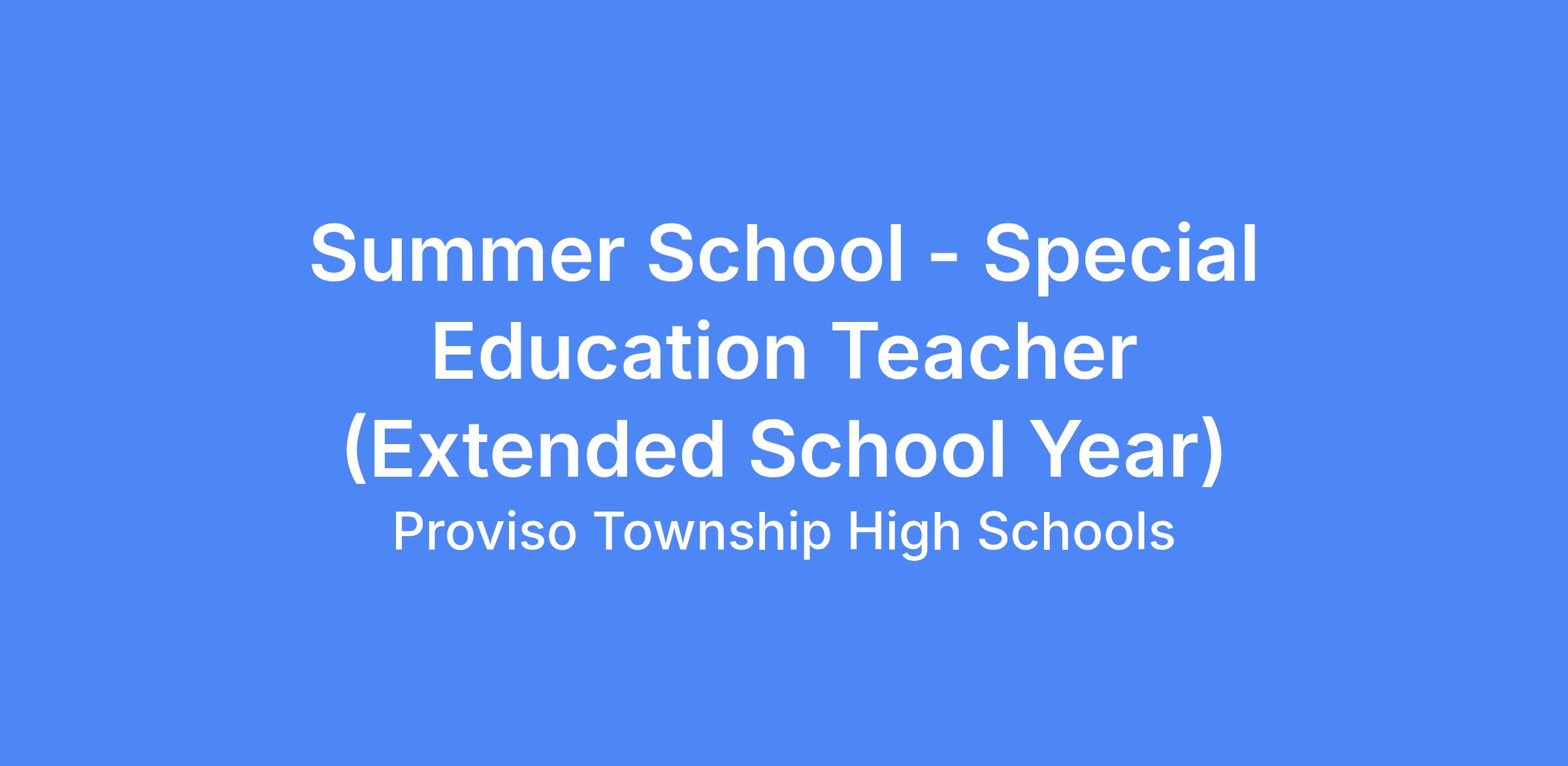 Proviso Township High Schools District 209 is seeking Special Education Teachers Instructional Extended School Year (ESY) during Summer of 2026. Teachers will engage students in meaningful, rigorous, standards-aligned learning opportunities to earn graduation credit for their course(s). Teachers will prepare lesson plans, design and grade formative and summative assessments, and provide in-person student-centered instruction while maintaining attendance records and grades on the district-approved Student Information System (SIS). Summer School teachers must have the required endorsements for the courses in which they teach. They must attend professional development prior to the first summer session and commit to both sessions. Courses will be taught in person.