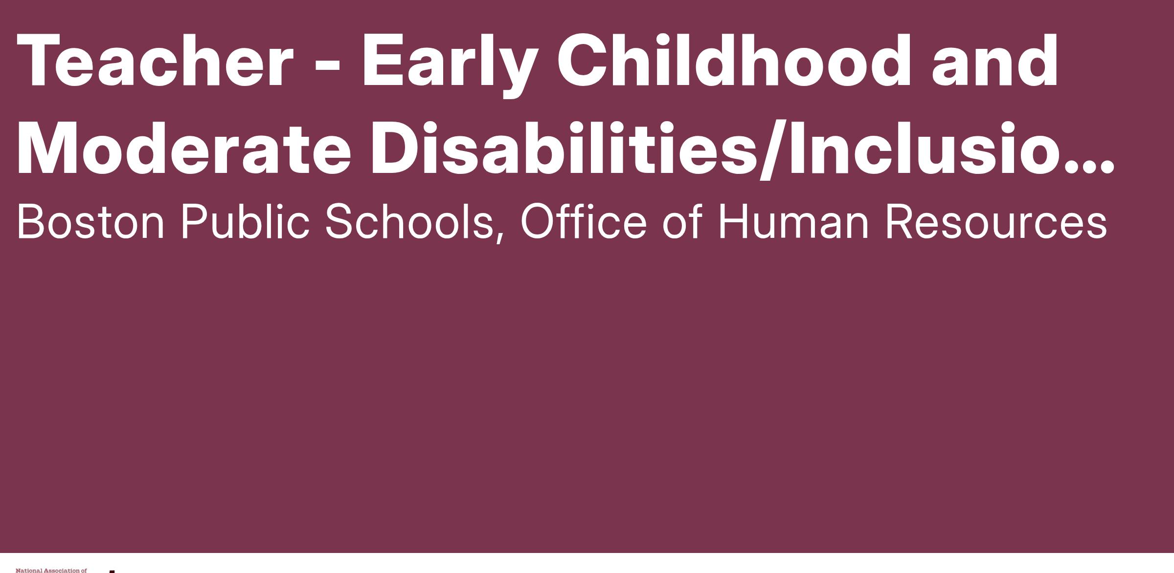 Boston Public Schools seeks an exceptional Early Childhood and Special Education Teacher with an SEI endorsement who is highly qualified and knowledgeable to join our community of teachers, learners, and leaders. This is an exciting opportunity for teachers who desire to serve where their efforts matter. In BPS, the teachers and leaders are committed to the vision of high expectations for achievement, equal access to high levels of instruction, the achievement of academic proficiency for all students, and the closing of the achievement gap among subgroups within the schools. BPS is a great place for those who seek to work in an environment that supports their creativity and innovation, and respects their skills and abilities as a teacher.