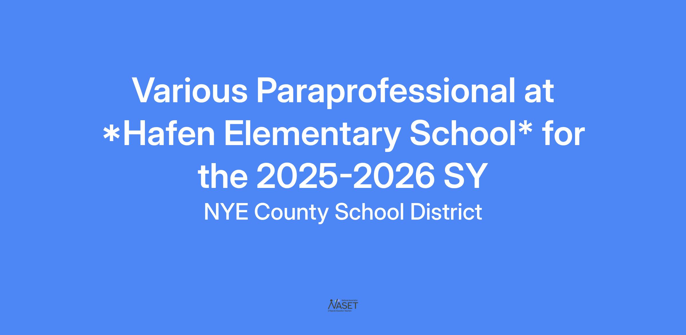 Description: Please understand that the position you receive may fall into one of these three different categories; 1.) School-wide Special Education Paraprofessional to assist classroom teachers and students with special education services across a variety of settings; including, but not limited to: School Campus, General Education, Resource, and Self-Contained Classrooms. 2.) Self-Contained Special Education Paraprofessional to assist the classroom teacher and students with special education services in a specialized instructional program. The paraprofessional will assist these students across a variety of settings; including but not limited to; school campus, General Education, Resource, and Self-Contained classrooms. 3.) 1:1 Paraprofessional Special Education Paraprofessional to assist a student with special education services. The paraprofessional will assist the student across a variety of settings; including but not limited to; School campus, General Education, Resource, and Self-Contained classrooms.